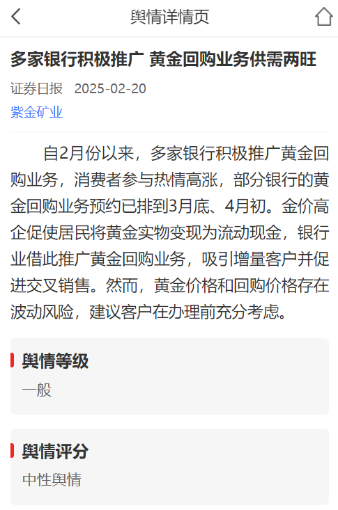 根据“希财网智汇舆情”平台的相关信息,2月份以来,多家银行积极推广黄金回购业务,吸引增量客户并促进交叉销售,消费者参与热情高涨。多家银行网点理财经理称,目前咨询黄金回购业务的客户数量较多,业务办理需要提前一天打电话预约,个别银行黄金回购业务的预约日期已经排到了3月底、4月初。