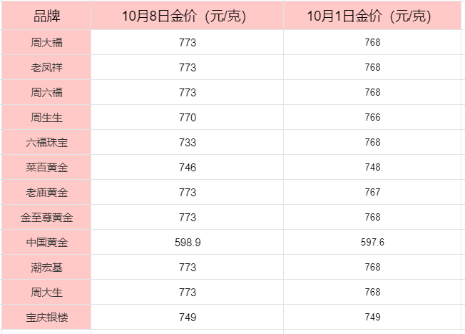 周大福黄金价格:773元/克;老凤祥黄金价格:773元/克;周六福黄金价格:773元/克;周生生黄金价格:770元/克;